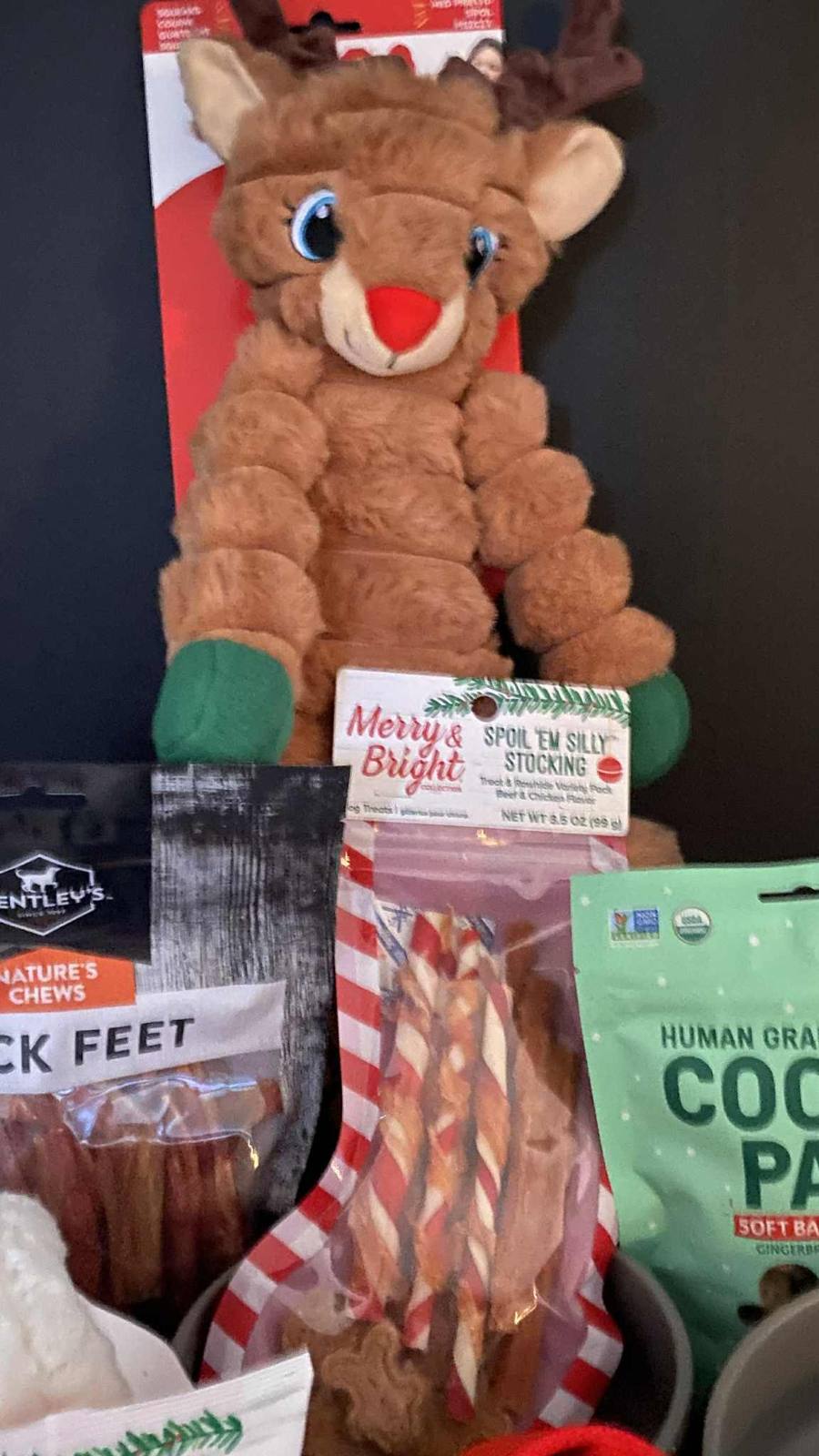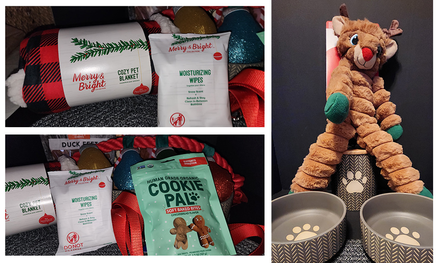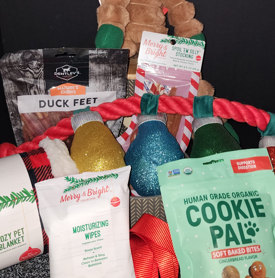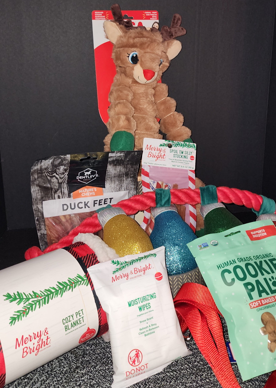 Dog Treat Bucket Matching Food and Water Dish Feeding Mat Cozy Pet Blanket 6' Red Dog Leash Christmas Lights Knooted Dog Toy Kong Holiday Reindeer Duck Feet Treats Spoil 'em Silly Stocking CookiPal soft Baked Bites Moisturizing Wipes