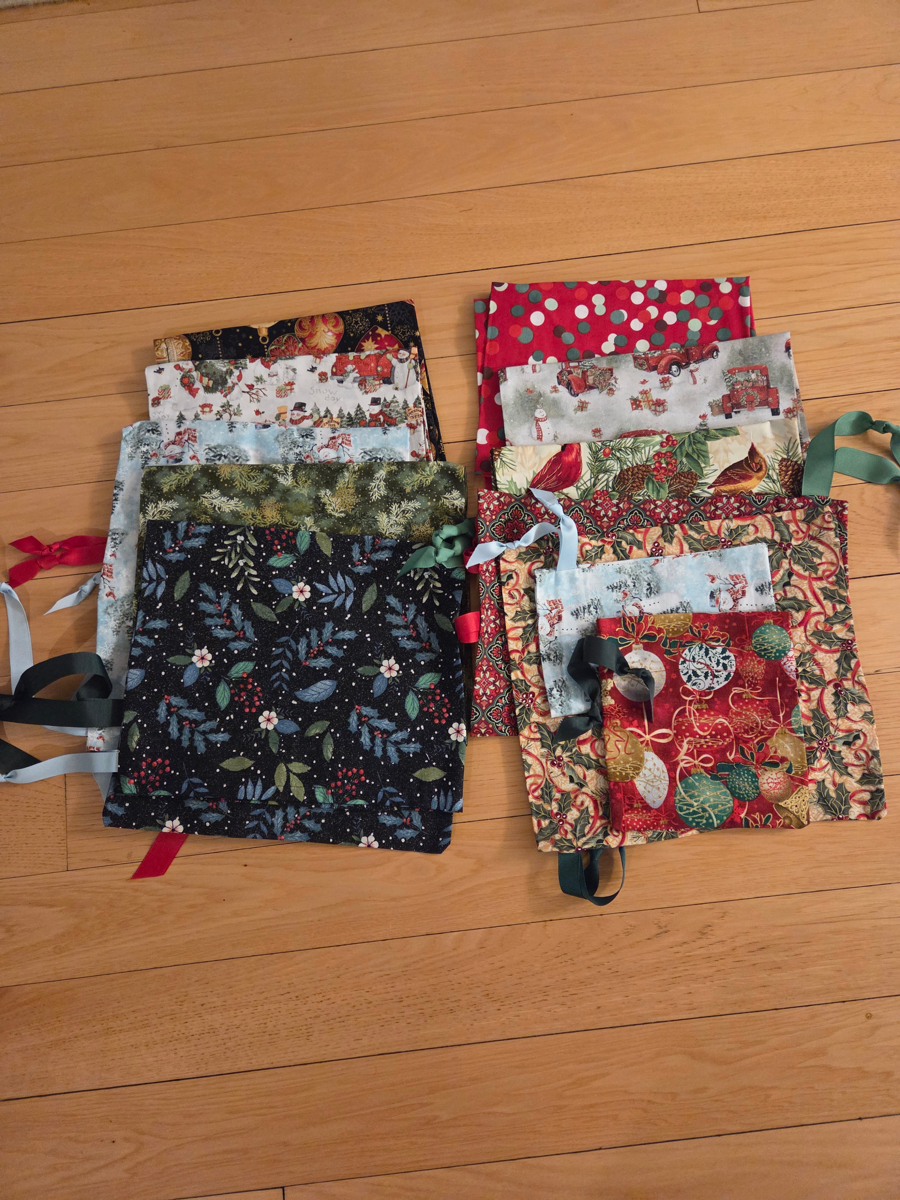 Use these handmade fabric holiday gift bags year after year - no more wrapping paper and scotch tape! Set of 10-12 in various sizes.