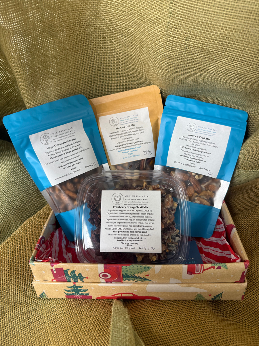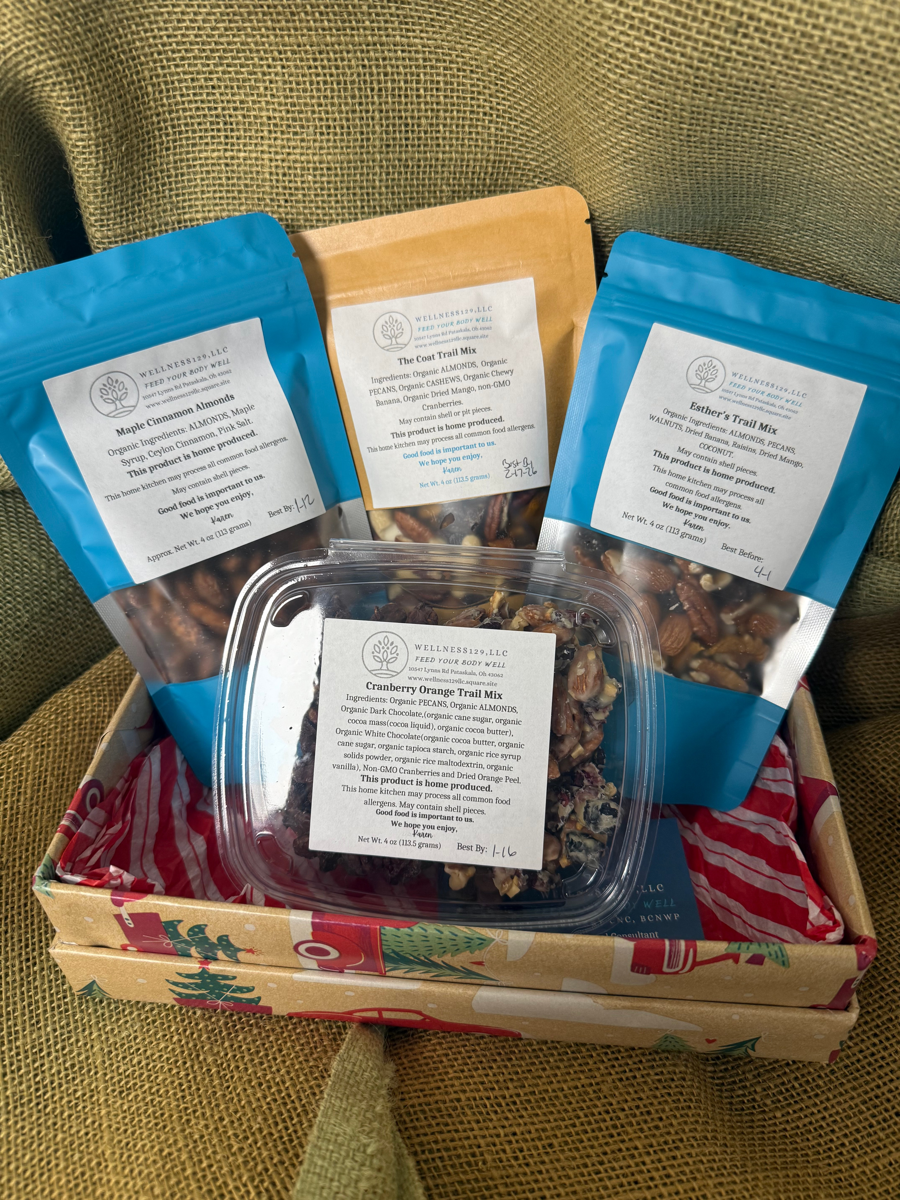Perfect for the trail mix enthusiast! This basket features some of my most popular blends, plus a brand-new holiday treat. Enjoy a variety of delicious, wholesome mixes made with organic and non-GMO ingredients: Maple Cinnamon Almonds - Sweet, crunchy, and perfectly spiced for the season. Esther’s Trail Mix – A fan favorite, packed with satisfying flavors and textures. The Coast Trail Mix – A bright and refreshing blend with just the right balance of nuts and dried fruit. Cranberry Orange Trail Mix – A festive mix with half dark chocolate and half white chocolate coating for the perfect indulgent touch. A thoughtful and tasty gift for anyone who loves snacking well, whether on the go or at home!