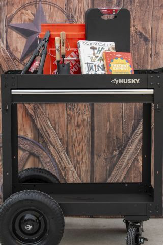 Husky Rolling Utility Cart, Compact Bypass Lopper, Pruning Sealant, All Purpose Cleaner, Wooden Hand Cultivator, Wooden Trowel, Kneeling Pad and a Home Depot Bucket.