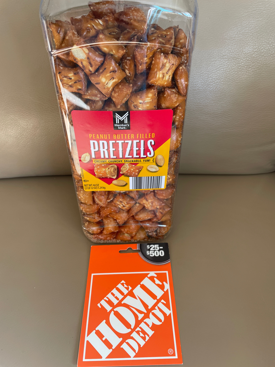 $100 gift card to Home Depot and Peanut Butter filled Pretzels- 2lb 12oz. 2 gifts in one!
