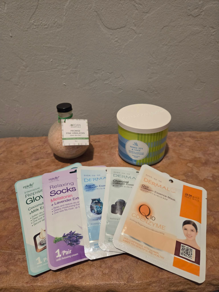 Warm plush blanket + various face/hand/feet masks + pink Himalayan bath salts + candle