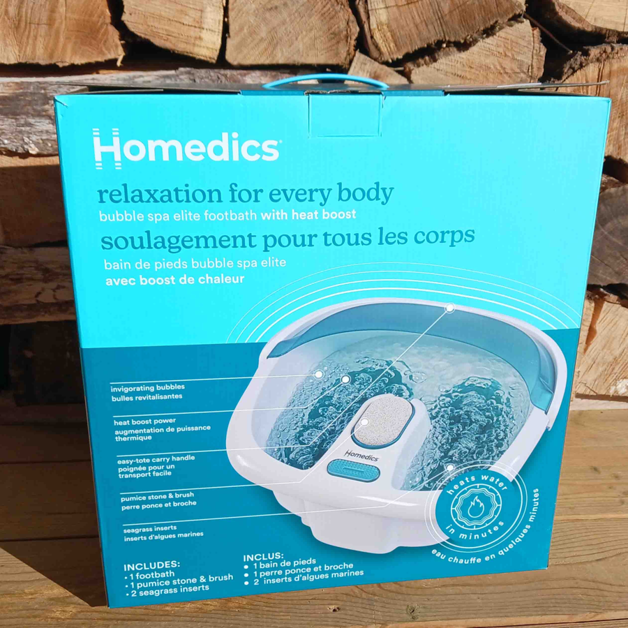 Treat your feet to the Homedics Bubble Spa Elite Footbath with Heat Boost. An invigorating bubble massage with heat boost power for warm water from start to finish. Rejuvenate Feet: Seagrass inserts stimulate soles; invigorating bubbles provide added relaxation Heat Boost: Turn cold water into warm in minutes; maintains consistent water temperature Toe-Touch Controls: Easily turn machine on or off with touch of a toe; no need to bend over/down Additional Features: 2-in-1 removable pedicure center with pedicure brush; integrated splash guard; easy-tote handle Included are 2 Seagrass Inserts, a Pedicure Brush and a Pumice Stone.