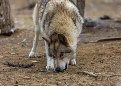 Paw prints from resident low-content wolfdog Honey on thick paper. The only thing we know from before Honey's life before Wild Spirit is that she was running loose for roughly 10 months in the New Mexico wilderness, just outside the small town of Las Vegas. Thankfully she was eventually captured, allowing us to take her into our care and ensure she would have a safe place to live out the rest of her days. Though she was EXTREMELY anxious around humans when she first arrived, Honey has slowly grown more comfortable in her home, especially thanks to the help of her more confident partner, Crow.