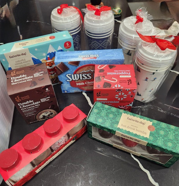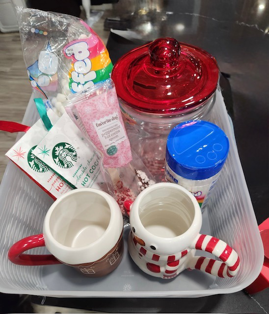 Cozy up with a warm cup of hot chocolate with ALL the toppings this holiday season with the Hot Chocolate Bar Gift Basket-courtesy of Ms. Stimans' 3rd grade class. $75 value. This basket includes: -3 kinds of hot cocoa mix -2 mugs -assortment of sprinkles/toppings -mini marshmallows -regular marshmallows -hot drink bombs -decorative disposable holiday cups -glass jar for storage -stirrers