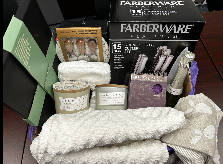 This thoughtfully curated collection includes a large white throw blanket, Welcome mat, hand towels for both the kitchen and bath, two Sand+Fog candles, fire extinguisher bottle of Prosecco, Farberware 15-piece cutlery set, marble 4-piece cheese set, a plastic cutting board set.
