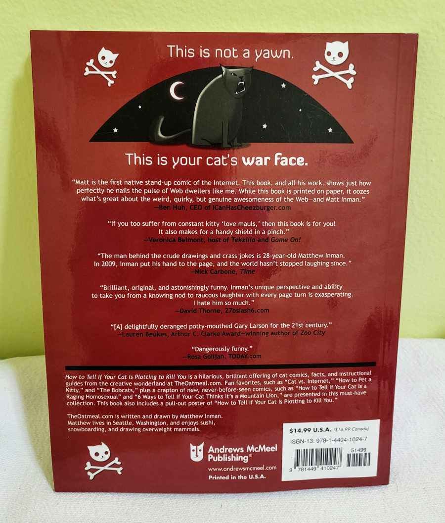 "How to Tell If Your Cat is Plotting to Kill You" includes popular cat jokes found on TheOatmeal.com. This well-loved satirical website brings you favorites like, "How to Pet a Kitty" and "Bobcats," plus 15 new comics created exclusively for this collection by Andrews McMeel. With the included poster, you can show your awe of your cat to friends and family, and enjoy some side-splitting laughter.