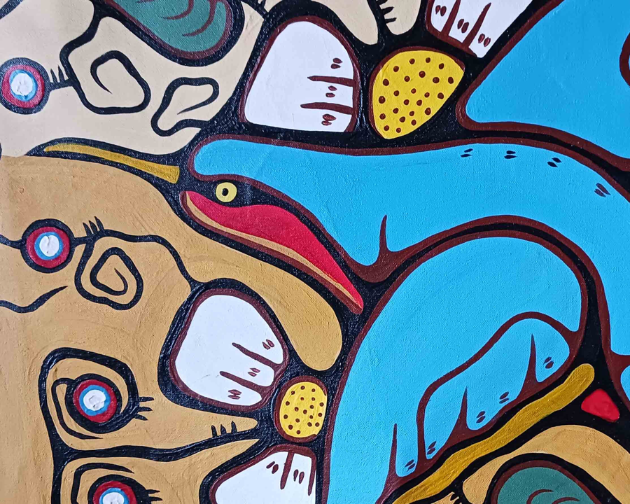 This painting, although unsigned, is an original by Brian Marion. He painted it during his most difficult times, and it was given to us by one of his good friends. Marion was born on October 6, 1960, in Kamsack, Saskatchewan, growing up amongst the Saulteaux and Cree of the Prairies and the Ojibway of the Northern Woodland of Ontario. In 1975, Brian began a nine-year apprenticeship with Norval Morrisseau, the internationally renowned Canadian Native Artist and founder of the Woodland School of Art. He suffered from alcoholism and depression and sadly passed away in 2011. Size 20" x 24" on canvas.
