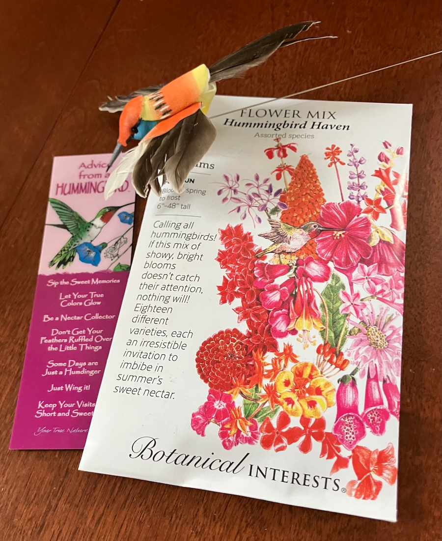 Everything needed to attract and enjoy hummingbirds! The reusable woven basket contains a large, red, glass hummingbird feeder with attached decorative glass balls by Sunset Vista Designs; a bottle of Sweet-Seed’s ready-to-use nectar (free of dye and preservatives); a package of Botanical Interests Hummingbird Haven mixed flower seed for a sunny area; an Advice from a Hummingbird bookmark; a Perky-Pet beaded copper hummingbird perch; a Custom Decor decorative hummingbird garden flag; and a Regal Art & Gift, 9” metal decorative hummingbird for table or branch, all topped off by a small hummingbird indoor plant stake.