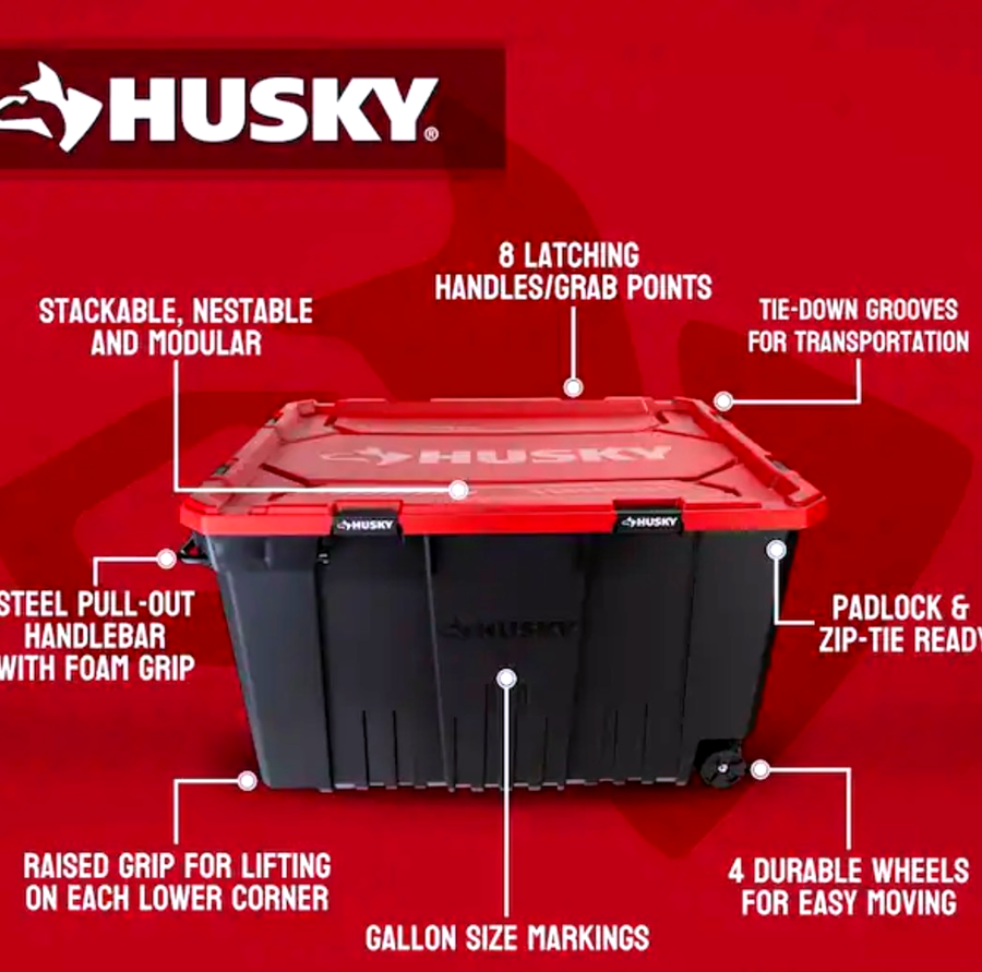 Introducing the Husky Tote, a versatile and spacious storage solution with an impressive 170-gallon capacity. This tote features a sturdy handle bar equipped with a comfortable foam grip, and four durable wheels.