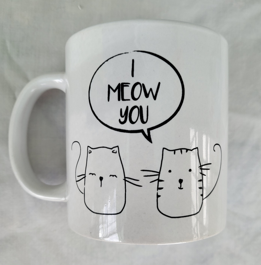 Sweet message from kitties on a white mug. Enjoy your favorite beverage in this 3" diameter x 3.5" tall mug with same design on both sides.