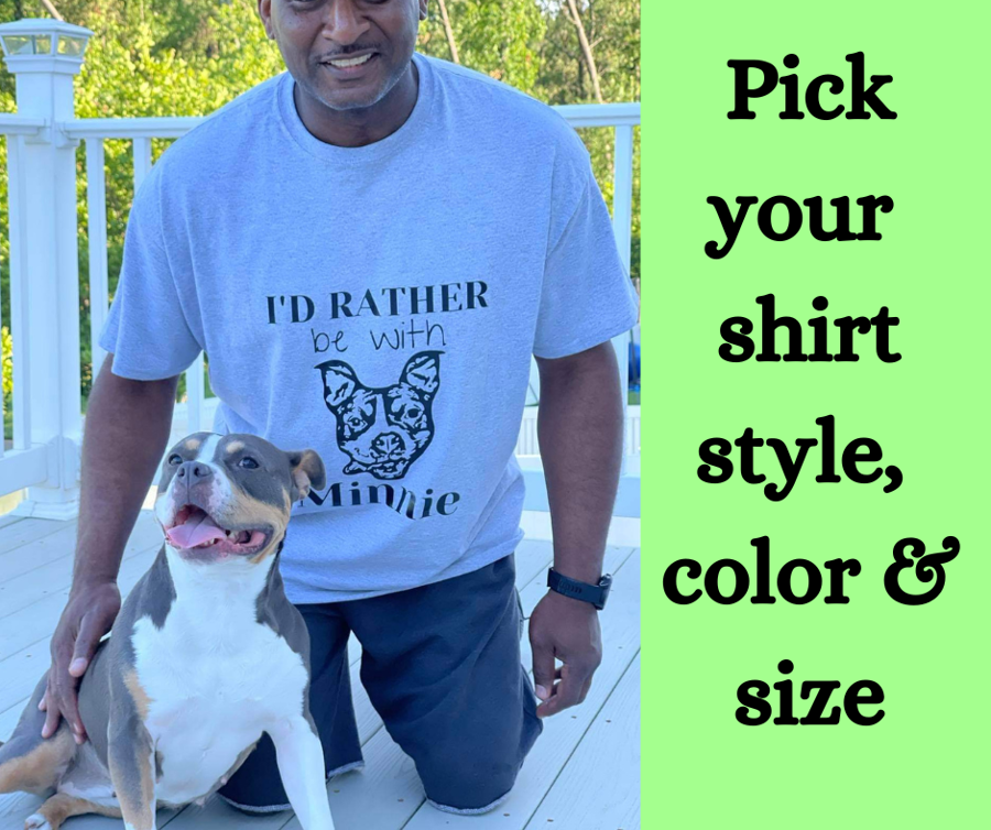 Bid on this one-of-a-kind custom shirt featuring the phrase "I'd Rather Be With..." Perfect for dog lovers, this shirt allows you to express your passion while supporting a great cause! Customization Options: Choose your preferred shirt style, color, and size Ideal Gift: A unique and thoughtful gift for the holidays, perfect for any dog enthusiast! Proceeds from this auction item will benefit our mission to rescue and care for dogs in need. Don’t miss your chance to own this special shirt and make a difference for our furry friends!