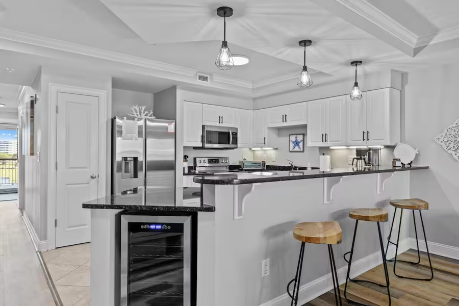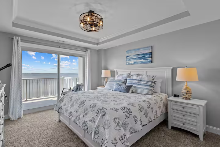 This bright & serene, 3-bedroom, 3-bathroom condo is one street over, or approximately a 10 min. walk, to public beach access with free parking. Sleep 7 comfortably with 2 King beds, 1 Queen & sleeper sofa. Spacious and well-stocked kitchen. Soak in the sunset on the private balcony, with 8-top dining table, which overlooks the Bogue Sound. Complex amenities include a pool, fitness center, game room, outdoor grills, boat launch, dock access and more! Beach chairs provided with rental.