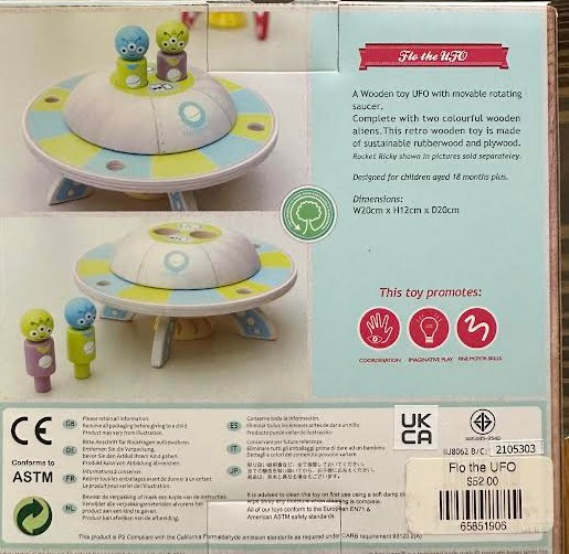 A charming retro-style wooden UFO featuring a movable flying saucer and playful design. Indigo Jam-Flo takes flight in this imaginative space-themed toy, blending nostalgic craftsmanship with hands-on fun. A unique, display-worthy piece that’s perfect for play or collecting.