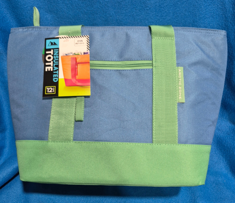Insulated tote, light blue and green. Holds 12 cans 10"x 16".