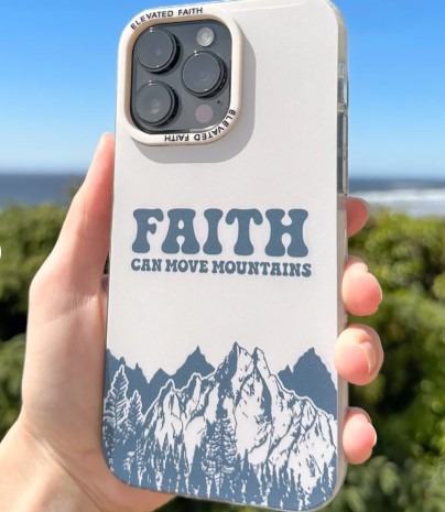 This specific case is for the iPhone 14 Pro Max. Features a mountain graphic and the phrase "Faith Can Move Mountains," inspired by the Bible verse Matthew 17:20. Offers drop protection, a raised bezel for screen protection, and is compatible with wireless charging. Constructed with a durable polycarbonate hard shell and an inner rubber liner for dual-layer protection.
