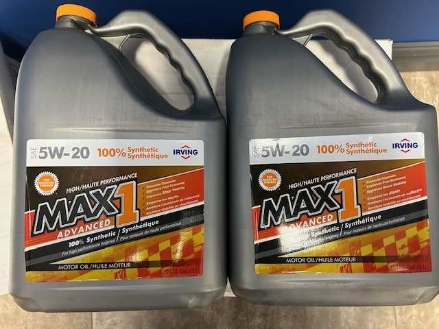 2 5L containers of Irving MAX Advanced 1 Synthetic Oil - donated by C&C Petroleum, Bonavista.