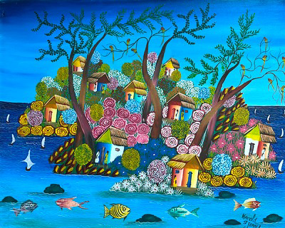 In the gentle island breeze, life is blooming: flowers blossoming, fish swimming, people stepping out of their houses, branches budding and swaying--a scene that makes one wish for a never ending summer.