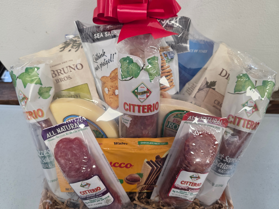 Assorted Cheese and meats Gift Basket including two bottles of Wagner wine and accessories. A great holiday gift to give to a person hosting a party or keep for your own party.