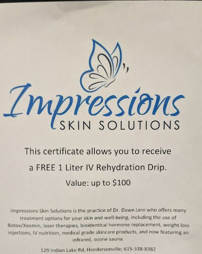 Experience the rejuvenating benefits of IV hydrotherapy at Impressions Skin Salon. For just $100, indulge in a revitalizing treatment designed to hydrate your body, boost your energy levels, and enhance your overall wellness. Our professional team will ensure you receive personalized care in a soothing environment, making this an ideal choice for anyone looking to refresh their mind and body. Don't miss out on this opportunity to elevate your health with our exceptional IV hydrotherapy service!