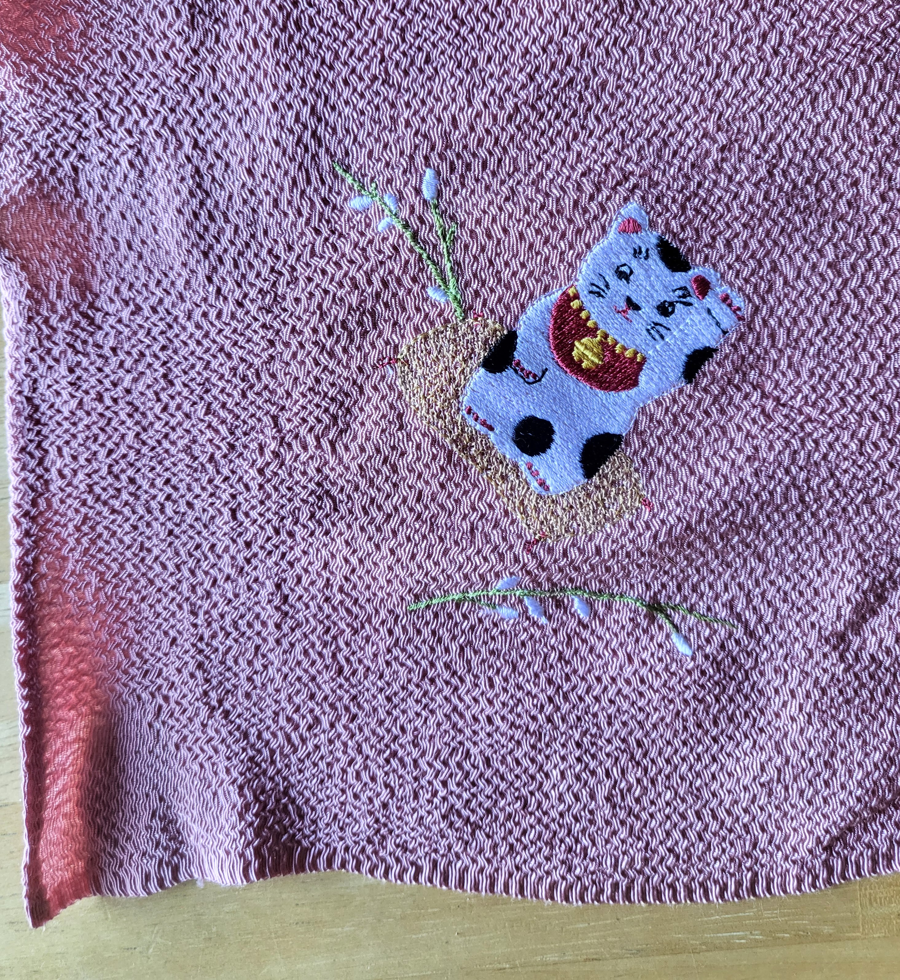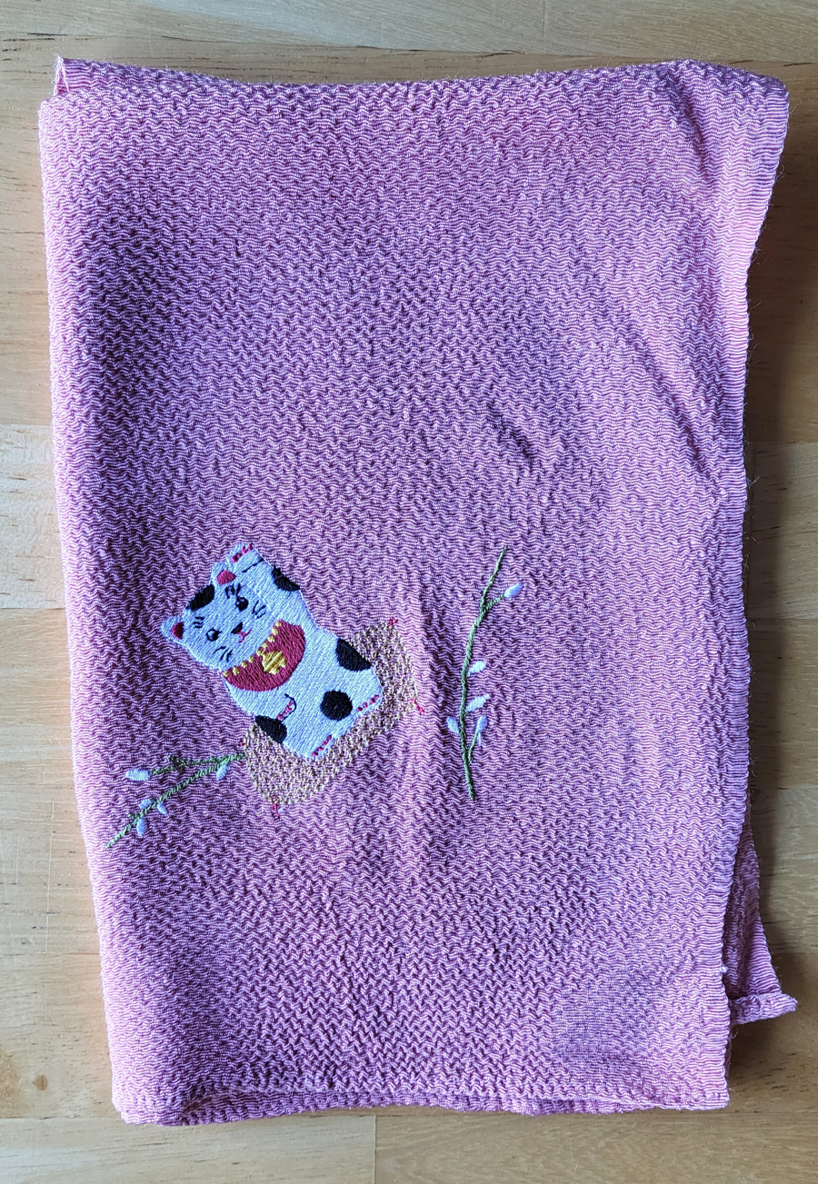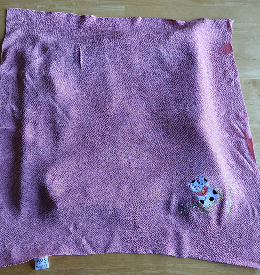 Furoshiki is the Japanese tradition of wrapping objects in cloth to cover or transport them. Here's an eco-friendly way to wrap a gift: use this rayon Furoshiki cloth with an embroidered cat on one corner. Pink salmon colored cloth with traditional waving "Welcome Kitty". Cloth measures about 16" square.
