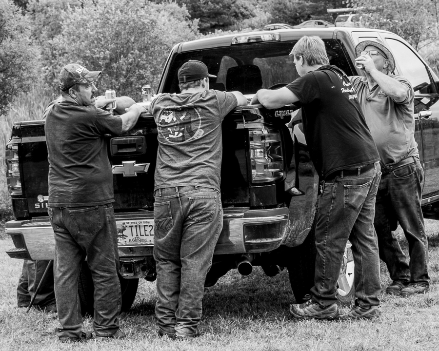 Jay loves taking photographs at local events. This 5 by 7 framed Black and White Photo depicts a gathering around a truck at the Danville Fair.