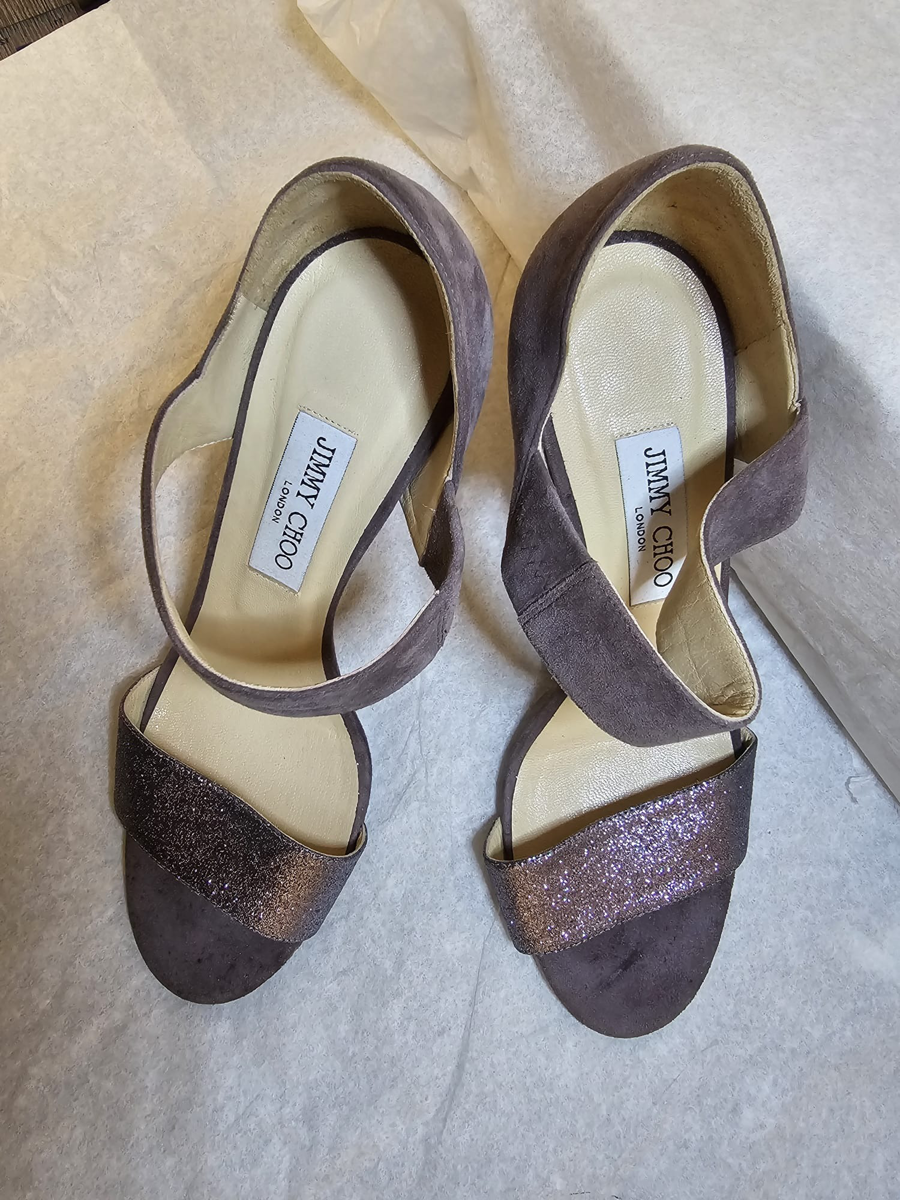 These Jimmy Choo stilettos are a “mauve” ( a hint of light purple and a hint of brown) suade. They are open toed with a hint of glitter on the front strap. There is no scuffing on heels however the soles do show signs of wear. The insoles are in good condition. The color would be a great accent for a spring wardrobe.