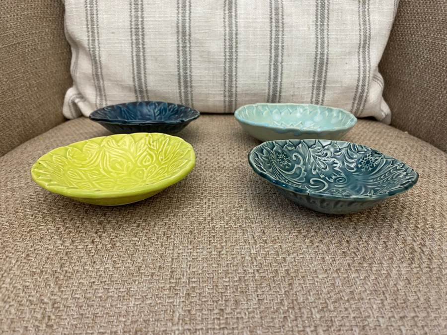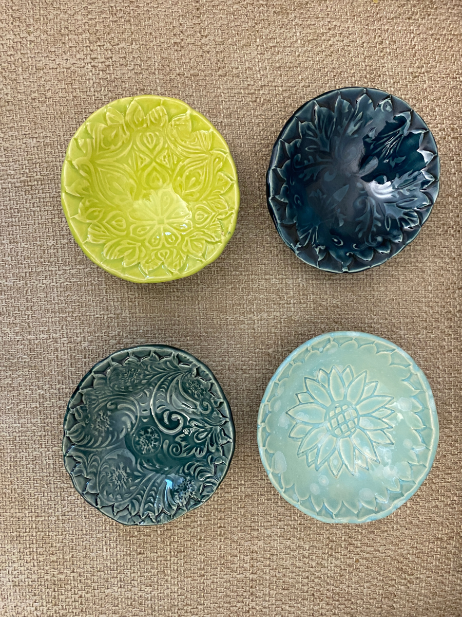 Add a pop of color and artisan craftsmanship to your table with this set of four handcrafted ceramic dishes by Granby Artist Association member Jane Furca. Each small dish features a beautifully embossed pattern and unique glaze, making every piece one-of-a-kind.