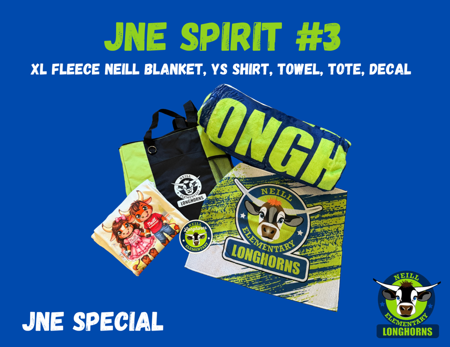 Show you JNE Longhorn Spirits at home and on the go! This includes one XL Neill Fleece Blanket, one YOUTH SMALL shirt, one JNE branded tote, small spirit towel (that matches the blanket) and 2 decals stickers.