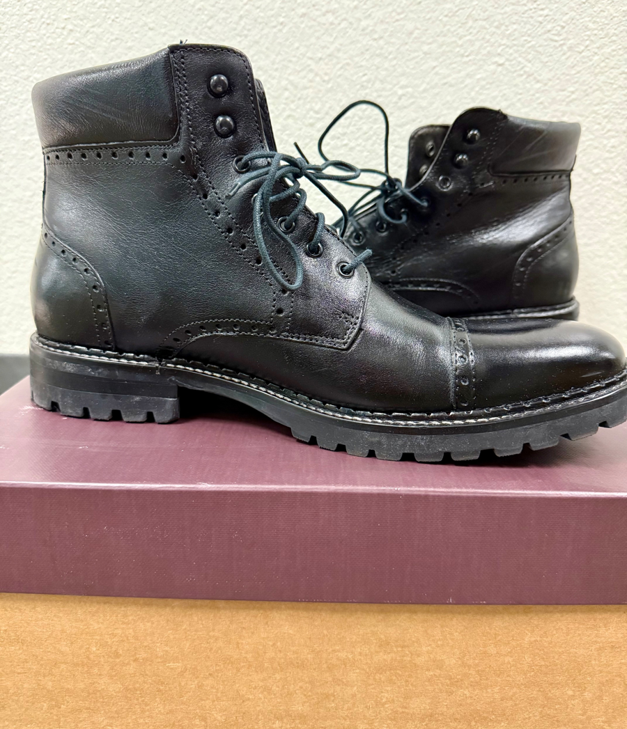 Johnston & Murphy Garrison Cap Toe Boot – Black, Size 9.5. Look sharp in these refined Johnston & Murphy Garrison Cap Toe Boots. Crafted from premium black full-grain leather, these boots feature a classic cap toe design with modern comfort in mind. The interior combines leather and textile lining with a removable cushioned insole for all-day wearability. Finished with a durable synthetic outsole and traditional lace-up closure. Made in Brazil. Size: 9.5 Upper: Full-grain leather Lining: Leather & textile Insole: Removable, synthetic Outsole: Synthetic Color: Black Made in Brazil