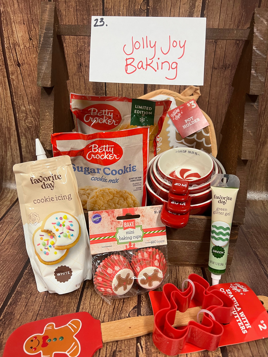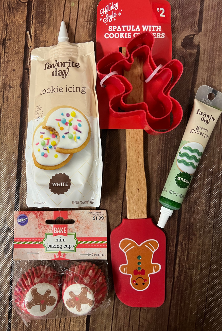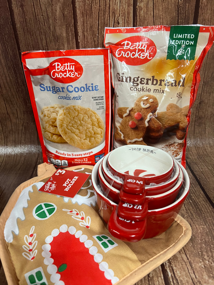 2 Cookie mixes: sugar and gingerbread potholder, and ceramic measuring cup set white icing and green glitter gel spatula and cookie cutter set, small muffin cups wooden tree basket