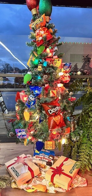 A 6ft tree covered in junk food goodness! Layered with chips, candy, sweet treats and more! Comes with a junk food blanket and the following goodies! 1 Large Pizza from Giovannis 2 6 pack cookies from Crumbl Cookies 6 Buy One Get One Free Regular Sub from Penn Station $10 Gift Card to Red Robin $10 Gift Card to Zaxbys