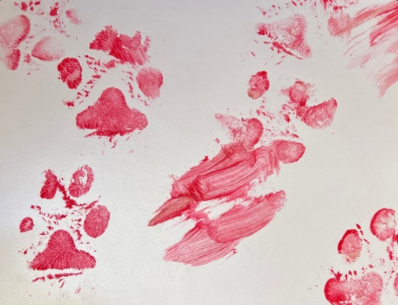 Paw print from mid-content wolfdog Kabbalah. Kabbalah came to Wild Spirit along with his three children, Quinn, Lyca, and Leia, as well as another relative who he still lives with today named Mystique. This sweet boy is confident but aloof, taking his time to trust people, but a lot more willing when food and treats are involved.