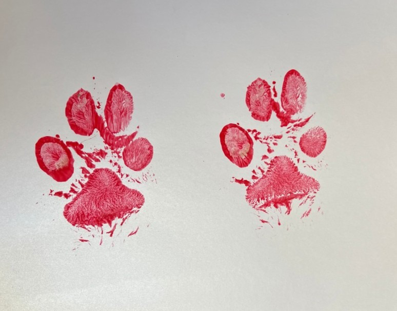 Paw print from mid-content wolfdog Kabbalah. Kabbalah came to Wild Spirit along with his three children, Quinn, Lyca, and Leia, as well as another relative who he still lives with today named Mystique. This sweet boy is confident but aloof, taking his time to trust people, but a lot more willing when food and treats are involved.