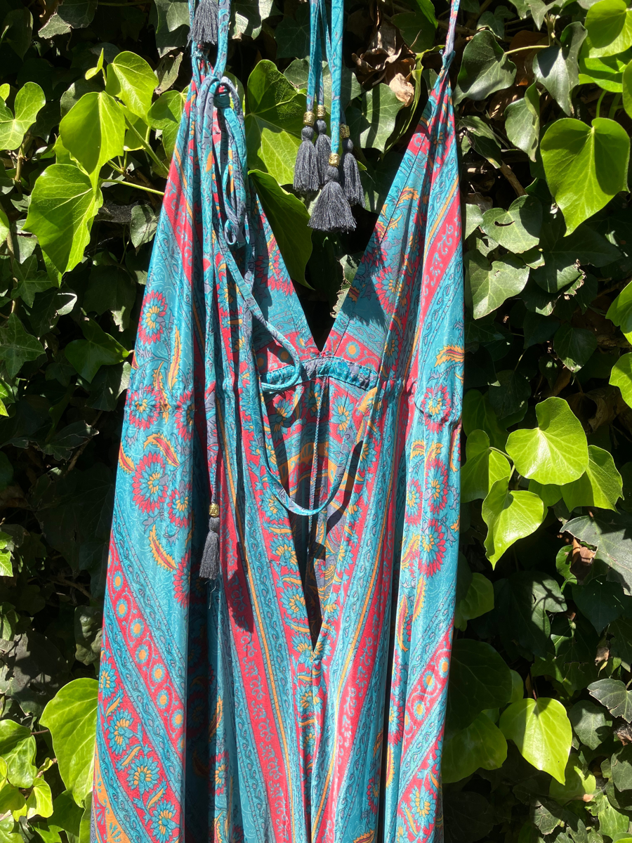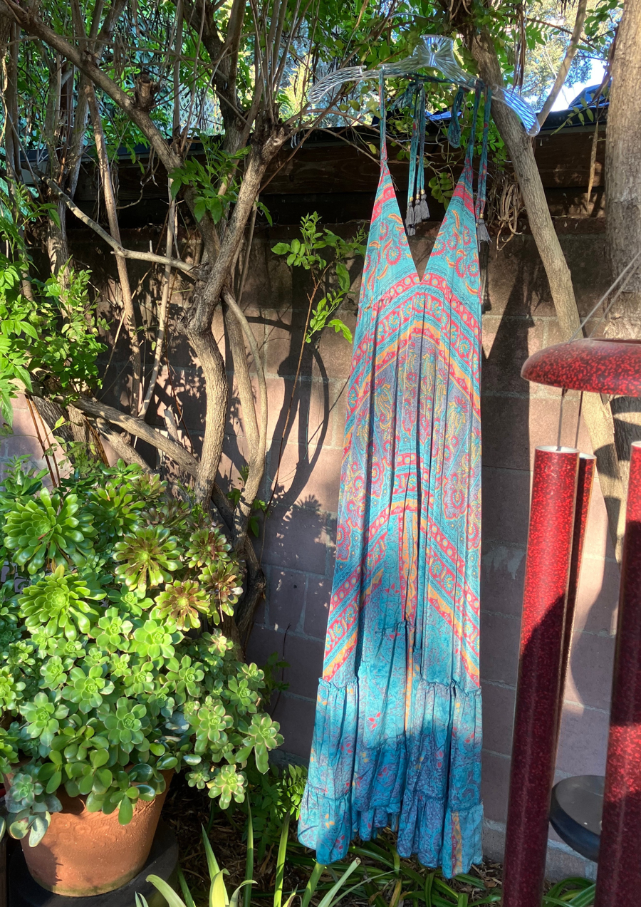 This bohemian-style maxi dress made of 100% viscose (a soft breathable fabric) features a halter neckline, high waist and adjustable ties for neck. Designed for a flowy, relaxed, and feminine look, this pretty dress will be a hit all around. One size fits many.