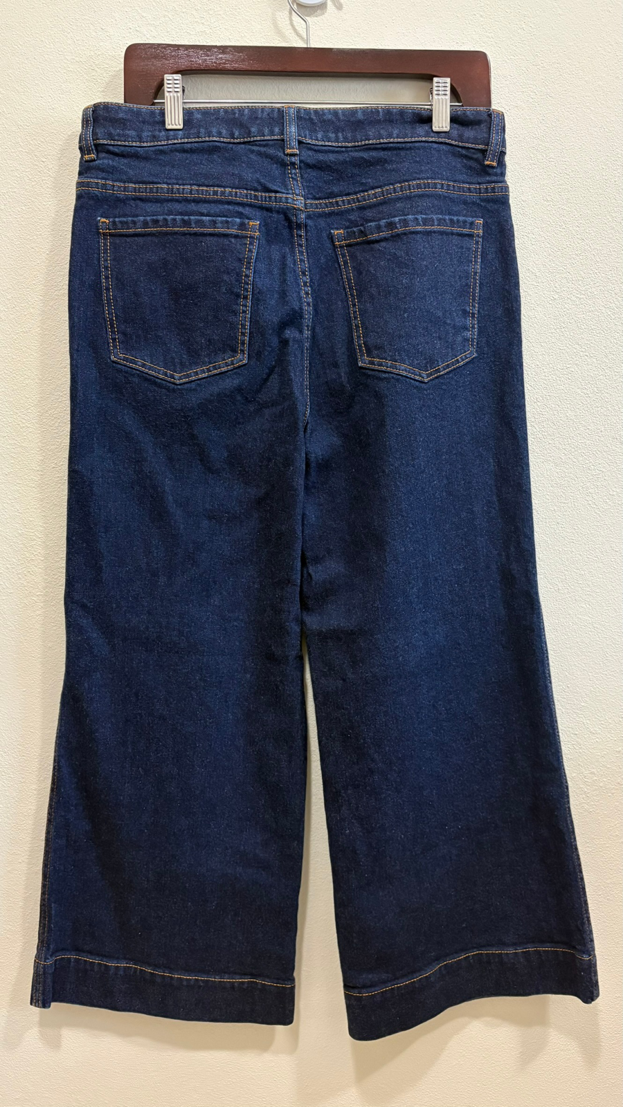 Contemporary wide leg fit denim jeans that are both comfortable and on trend. The design includes a classic five-pocket layout with a button and zip closure. Tan stitching adds subtle detail, while the small floral embroidery on the front inner pocket adds a charming touch. There are no noticeable flaws or signs of wear.