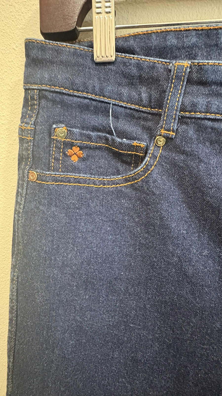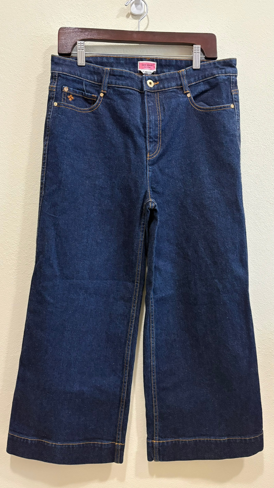 Contemporary wide leg fit denim jeans that are both comfortable and on trend. The design includes a classic five-pocket layout with a button and zip closure. Tan stitching adds subtle detail, while the small floral embroidery on the front inner pocket adds a charming touch. There are no noticeable flaws or signs of wear. Note: fits smaller than sizing on label