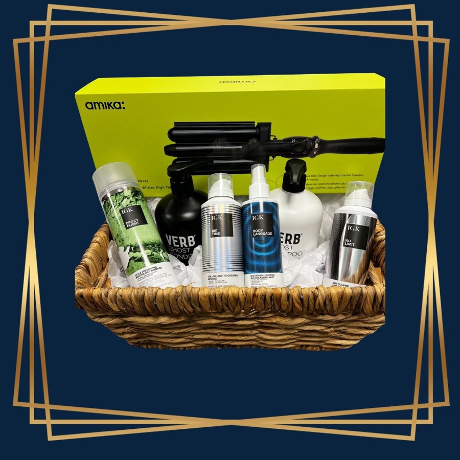 Indulge in a thoughtfully curated basket filled with premium hair products and a styling tool to keep your hair looking fabulous and a blowout. Treat yourself to top-tier products and the perfect tools for maintaining your gorgeous style!