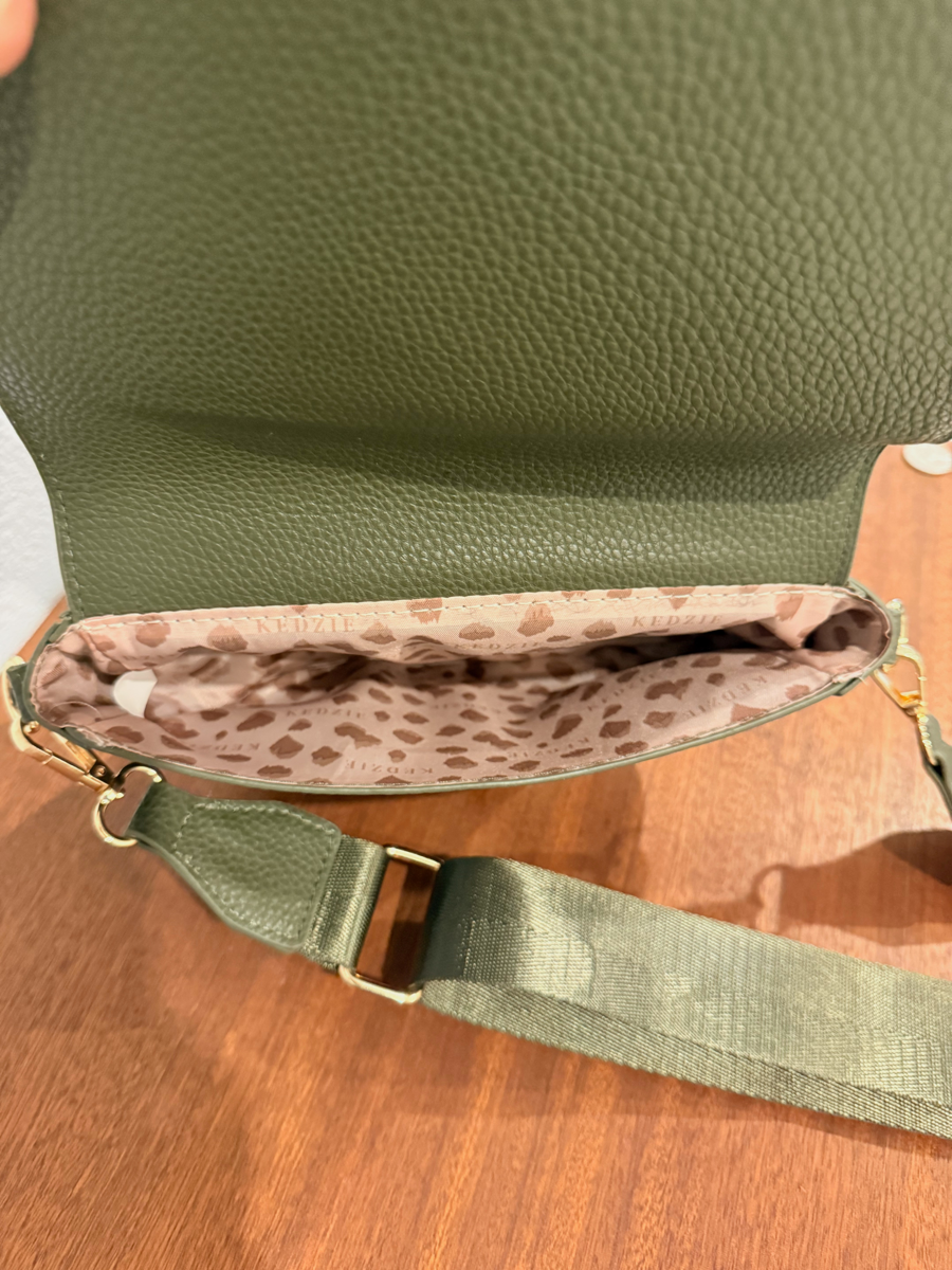 Olive Luna crossbody bag with adjustable, removable straps. It is pebbled vegan leather with fold-over closure with magnetic snap. There is a back slip pocket with a large main compartment. Has a cheetah print lining. Perfect for everyday or travel, plus this color is trending right now!