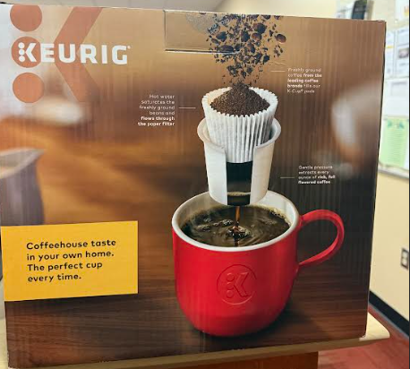 A brand new Keurig machine, in the box, plus two boxes of specialty coffee K-cups.