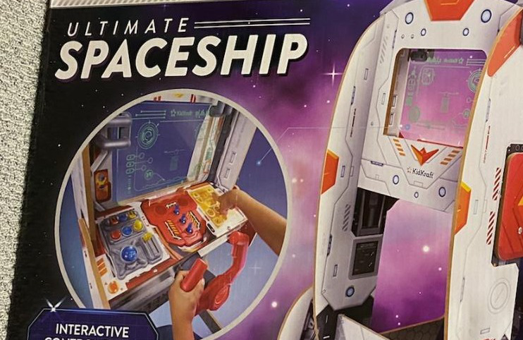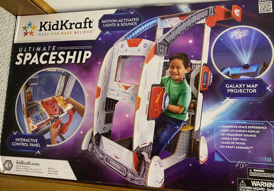 Ages 4+ Kids’ imaginations will blast off with the Ultimate Spaceship. This immersive play environment features lights and sounds, plus a star map projection. Measuring 55 inches tall, this is big enough for a child to step inside and engage in all sorts of out-of-this-world play. The interactive control panel has a variety of touch-pad controls that activate different sound effects, such as opening and closing the hatch, engaging light speed, and communicating with mission command. Three working switches activate the cockpit lights, the Head Up Display with three different light choices, and the star projection, which projects a star map onto the ceiling and looks best when you turn out the lights. Plus, additional switches, knobs, and levers both inside and outside the playset help promote fine motor skills and more pretend play. Kids can even collect space samples in the two test tubes stored in the back of the playset. Turn the steering wheel to pretend to steer toward your galactic destination. Kids can even rock the spacecraft from side to side to trigger more lights and sound effects.