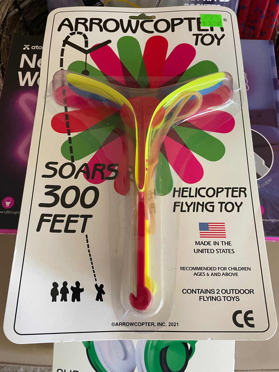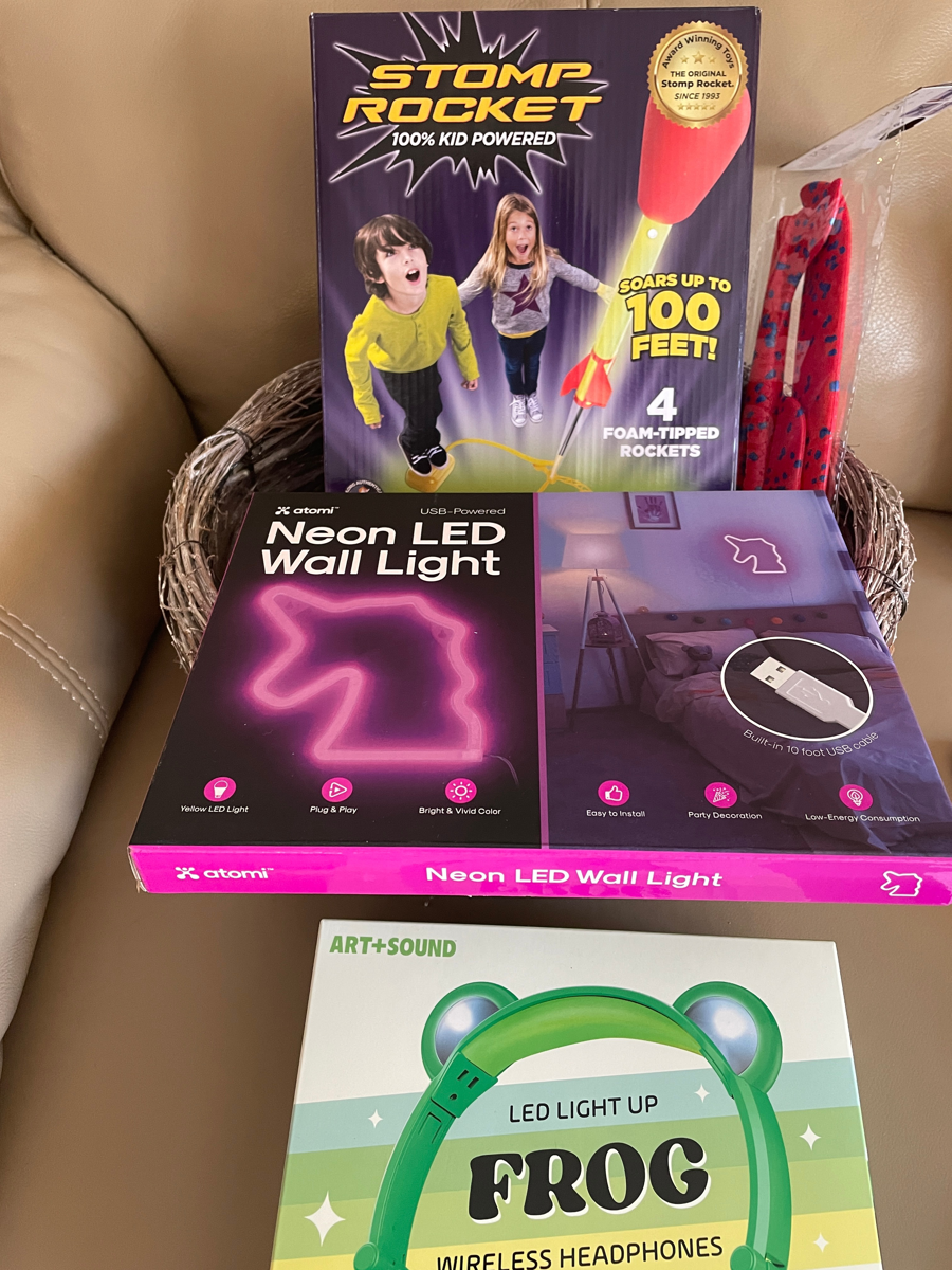 Kids can play with the many items in this basket. Stomp Rocket that fly's 100 feet!, Neon LED unicorn wall light, LED light up "Frog" wireless headphones 8 HR playtime, Super Glider, and an Arrowcopter toy-flying helicopter. Ideal for children 6 and up.