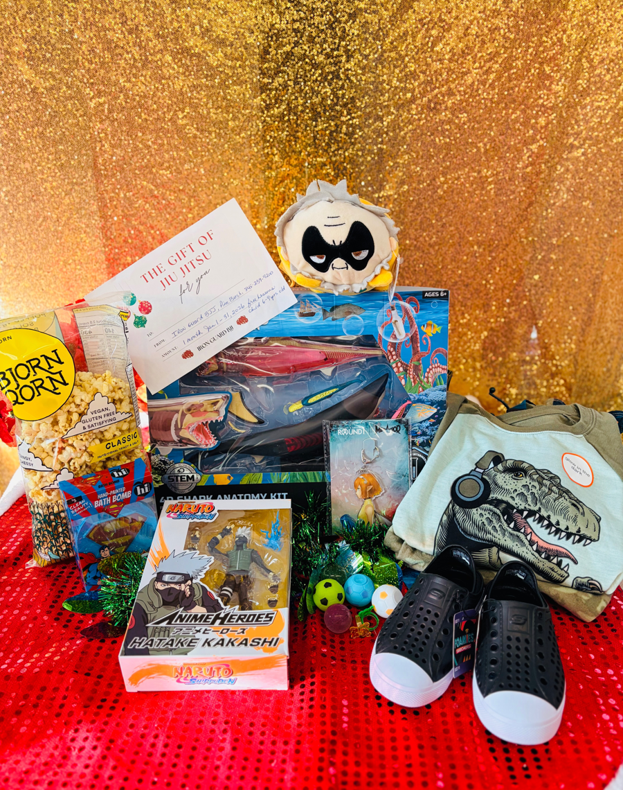 This bundle includes a 1 month gift certificate to Jiu Jitsu at Iron Guard BJJ in Pine Bush, NY., a superman bath bomb, kids foam sketchers (size 11), a keychain, a Naruto Anime heroes Hatake Kakashi action figure, size XL (youth) dinosaur pajamas, a My Hero Academia Mochibi Gran Torino, a bag of Bjorn Qorn, a pin, and a Discovery 4D Shark Anatomy Kit.