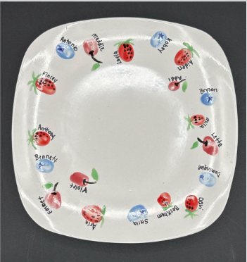 This plate is Berry Special! Student’s dipped their thumbs in glaze and created these Berry Cute Berries. Each berry is labeled with the student’s name.
