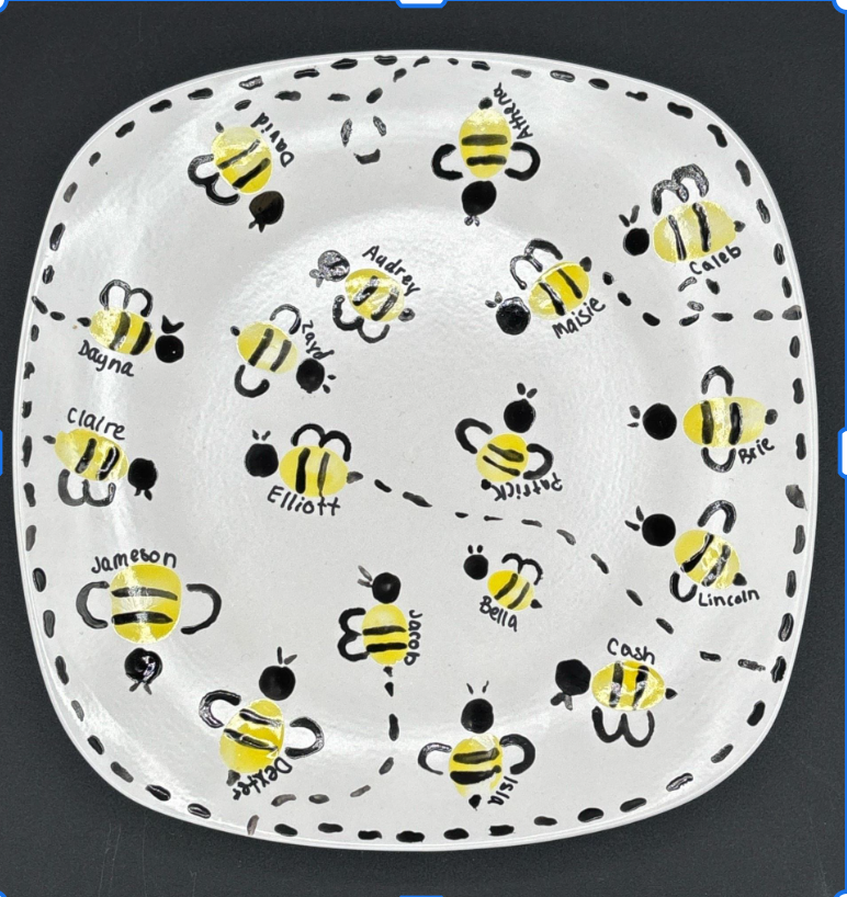 This plate is Bee-utiful! Student’s dipped their thumbs in glaze and created these bee-utiful little bees buzzing around the plate. Each bee is labeled with the student’s name.