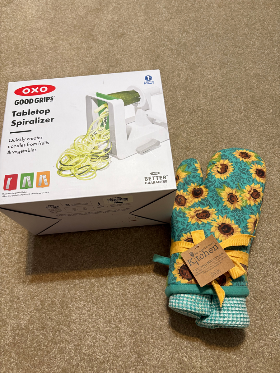 OXO Tabletop spiralizer with a kitchen mitt and dishtowels!
