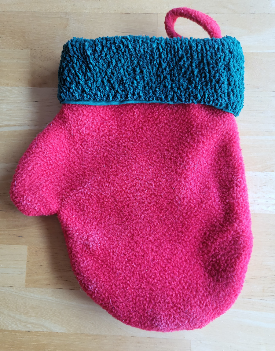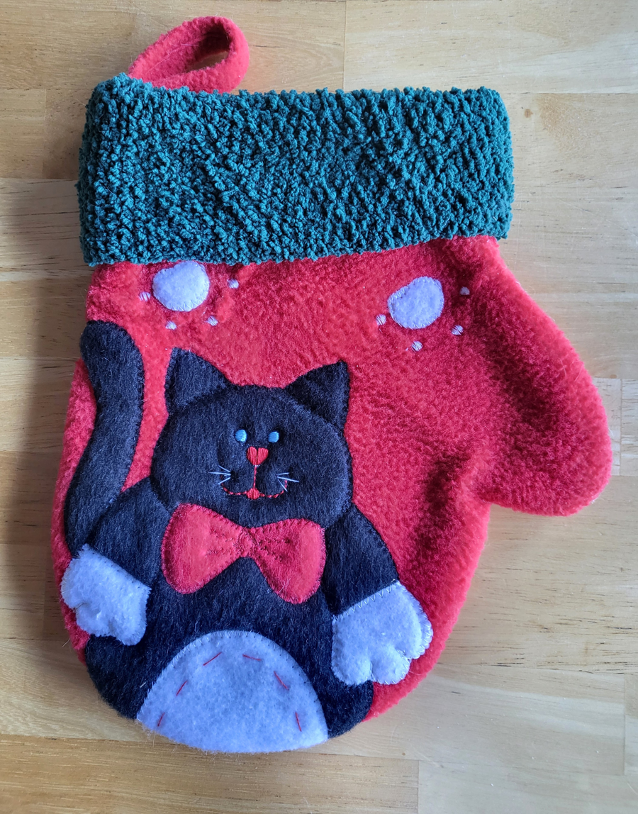 Fleecy stocking sports an eager black kitty wearing a red bow tie! Measures about 10" x 7", gently used.