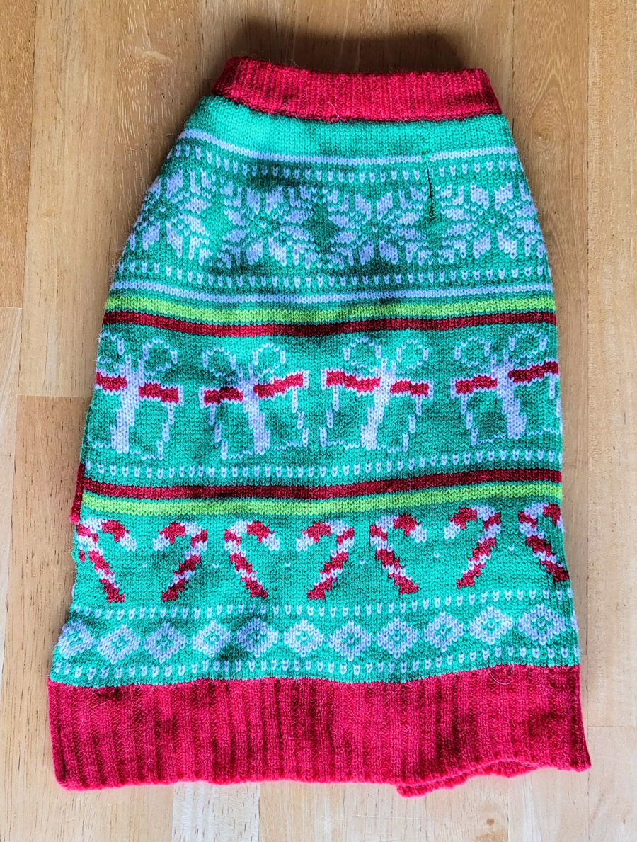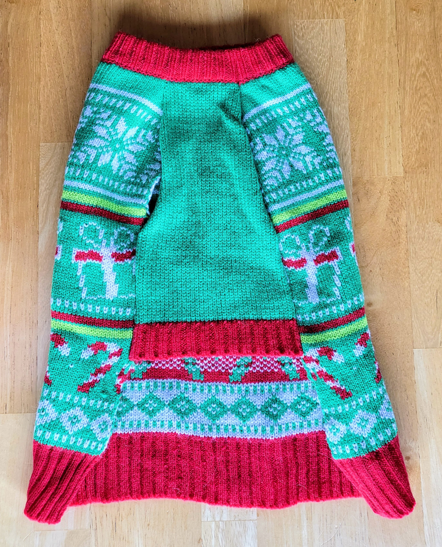 Keep your feline cozy with this festive knitted kitty sweater! Fits medium sized cats, measures about 13" long x 18" diameter.