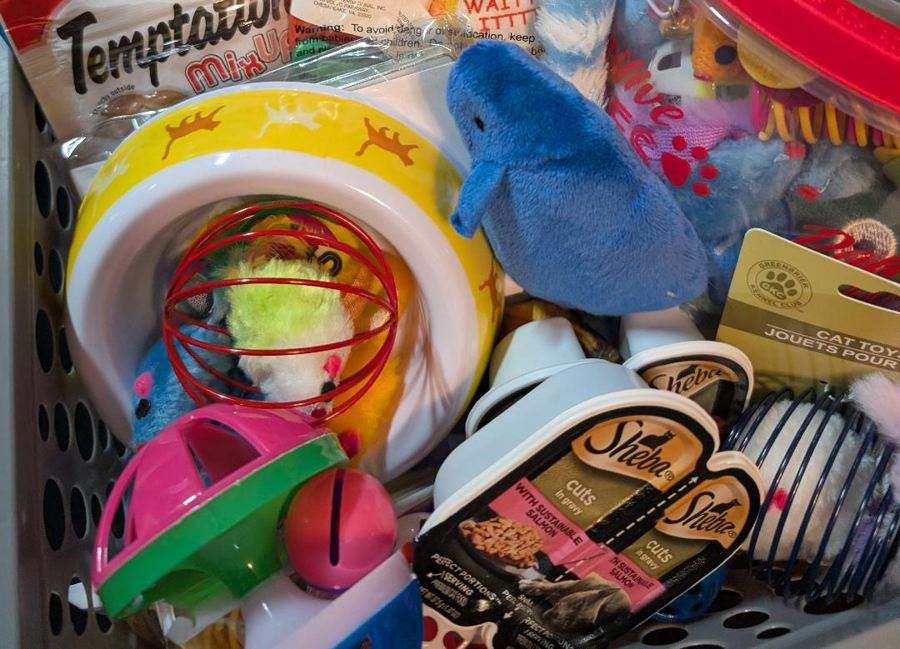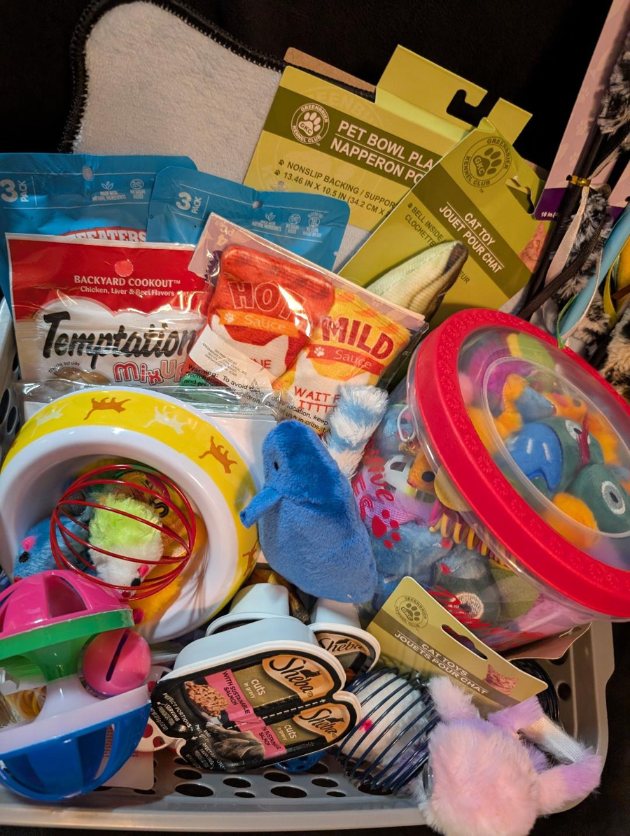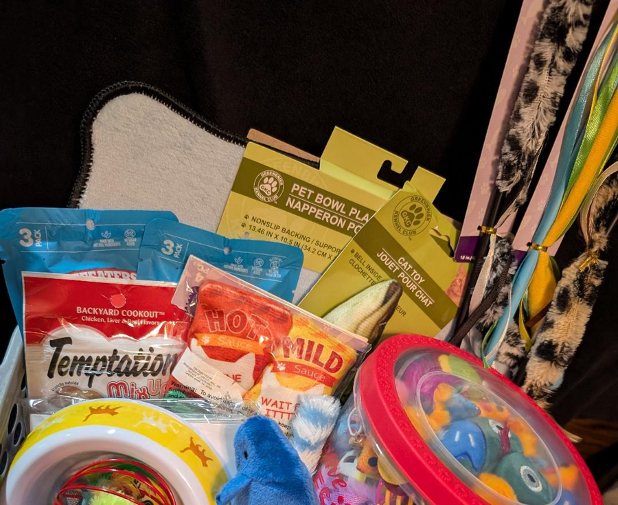 Huge tube of assorted cat toys, assorted treats, Pet Bowl Mat, & 2 bowls. This basket will spoil fluffy for the next 3 months with all these toys! Santa says that kitty cat has been mostly nice, maybe a little naughty, but still worthy of this beautiful basket full of toys!