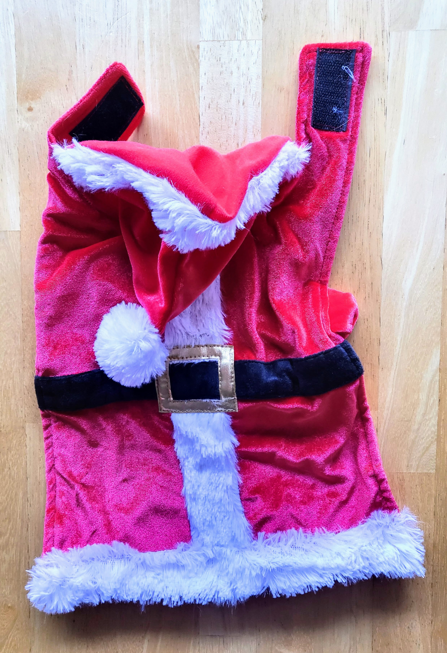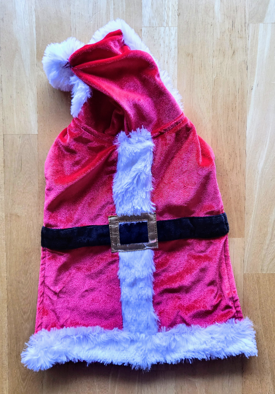 If your cat is patient, this Santa Suit could be part of a fun Holiday photo! Fits medium sized cats, measures about 10" long with 4" hood, 16" - 18 diameter with velcro closure. Cute!